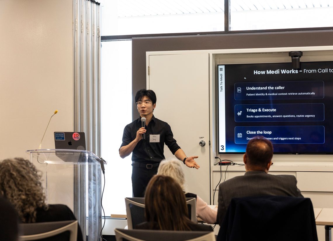 Kino Song of TalkToMedi / Medium AI (Runner-up): A voice-based healthcare assistant that automates patient scheduling, triage, and follow-ups. Integrated with EMRs, it reduces clinical workload and improves efficiency while maintaining safety through error-reduction protocols.